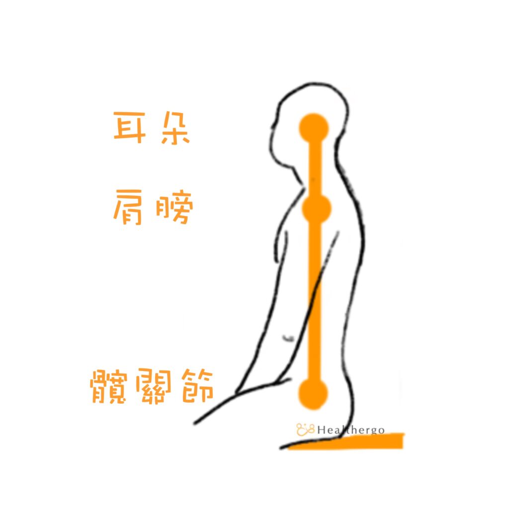 最佳坐姿(optimal posture)則是讓身體保持在這樣的脊椎狀態下,對身體各關節及軟組織負擔較小,也較能長時間坐著不會感到疲憊,從側面觀察坐姿,會發現耳垂、肩膀、髖關節會處於同一條垂直線上,且骨盆要能維持在中立的位置(坐在坐骨上)。