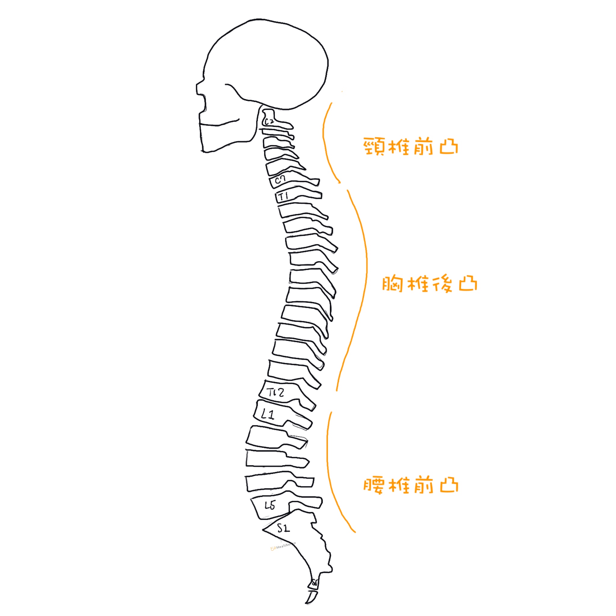 在正常的發展中,脊椎有天然的生理曲線(脊椎弧度),包含頸椎前凸、胸椎後凸及腰椎前凸,在這樣的弧度下,脊椎周圍的軟組織能提供較好的支持,也能均勻的分散壓力。