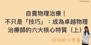 在物理治療師的職涯發展中,物理治療師常被教科書與制度框架所限制,誤以為「相同的診斷就會有相同的治療」。真正專業的物理治療師,不只是執行技術,更要理解病人的真實需求,靈活設計個別化的治療策略與衛教方向。這正是自費物理治療的核心價值所在:讓治療回歸病人本身,讓專業不被流程綁架,也讓治療師重新掌握自主與深度。對治療師而言,自費治療不只是模式的改變,更是職涯邁向成熟與獨立的重要一步。